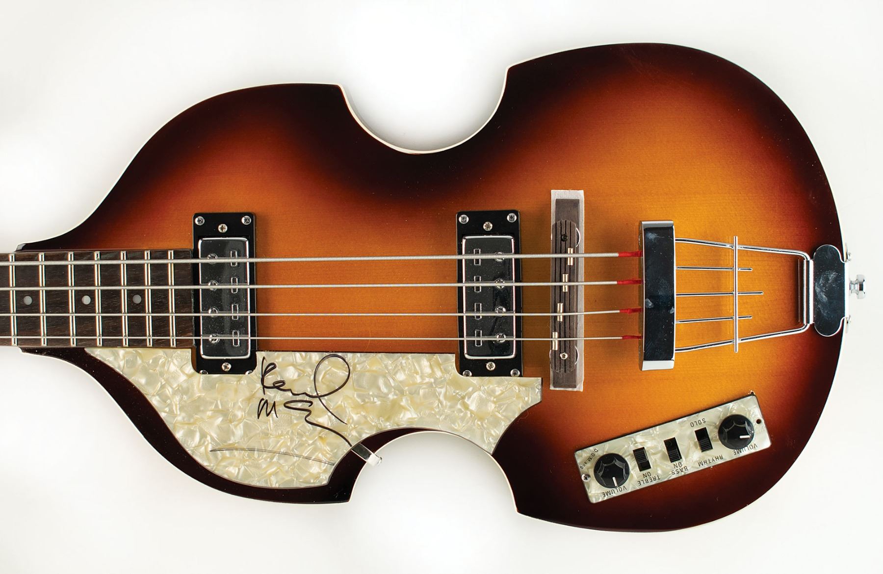Beautiful left-handed sunburst-finish Hofner 'violin' or 'Cavern' B-Bass HI-Series bass guitar, signed nicely on the pearloid pickguard in black felt tip by Paul McCartney. In fine condition. Accompanied by a full letter of authenticity from REAL and the Hofner shipping box. Originally designed by Walter Hofner in 1955, the beautifully shaped 'Beatle bass' remains a highly sought-after piece of musical equipment, with this instrument enhanced furthermore by its influential signer.