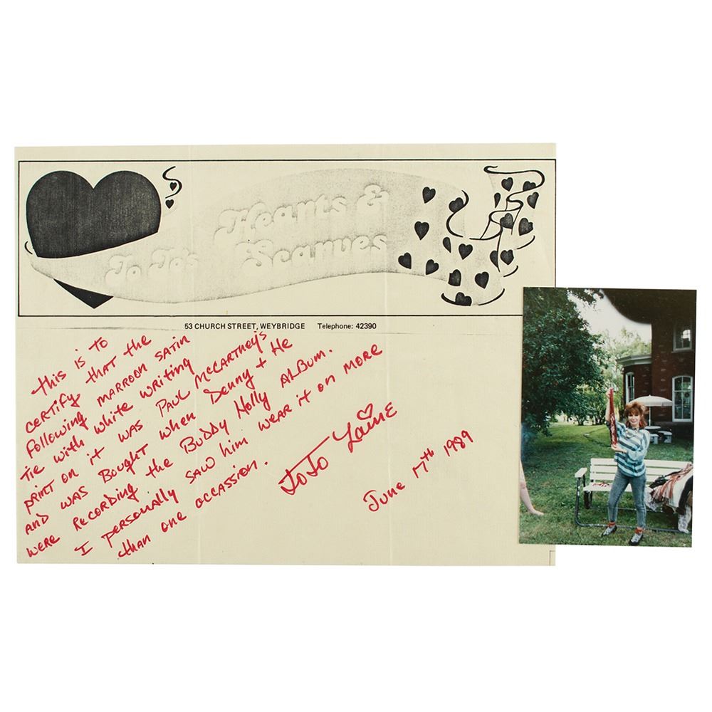 Very desirable maroon necktie by Hollyvogue of California, personally-owned and -worn by Paul McCartney in the 1970s and 1980s. Included with the necktie is a handwritten letter of provenance from Jo Jo Laine, the wife of Wings musician Denny Laine, who writes: “This is to certify that the maroon satin tie with white writing print on it was Paul McCartney’s and was bought when Denny & he were recording the Buddy Holly album. I personally saw him wear it on more than one occasion.” In fine condition. Accompanied by a photo of Jo Jo holding the necktie. The referenced “Buddy Holly album” is Holly Days, the second solo album from Denny Laine, which featured 11 cover versions of songs by Holly; released in 1977, the album was produced by McCartney, who also played most of the instruments on the album, although Linda McCartney played keyboards and sang harmonies.