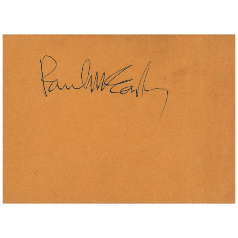 Vintage ballpoint signature, "Paul McCartney,‰Û on the back of an orange 4.25 x 2.75 business card for Ray's Old Bristol Restaurant. Included with the signature are two items signed by McCartney's former girlfriend and muse Jane Asher: a matte-finish 3.5 x 5.5 photo, signed and inscribed in the lower border in pencil, "To Jane, Best wishes, Jane Asher"; and a light blue 4.5 x 4 album page, signed in black felt tip, "Best wishes, Jane Asher," and also by Margaret Lamb and Stanley Bates, two of her costars from the play The Happiest Days of Your Life, which ran from December 1965 ‰ÛÒ January 1966. In overall fine condition. Accompanied by an original 4.7 x 3.75 candid photo of McCartney and Asher at the time of signing, which shows the couple backstage at the Bristol Old Vic when McCartney was visiting Asher during a performance of the referenced play; the consignor notes that the signatures and photo belonged to the daughter of the pub owner who obtained the signatures.