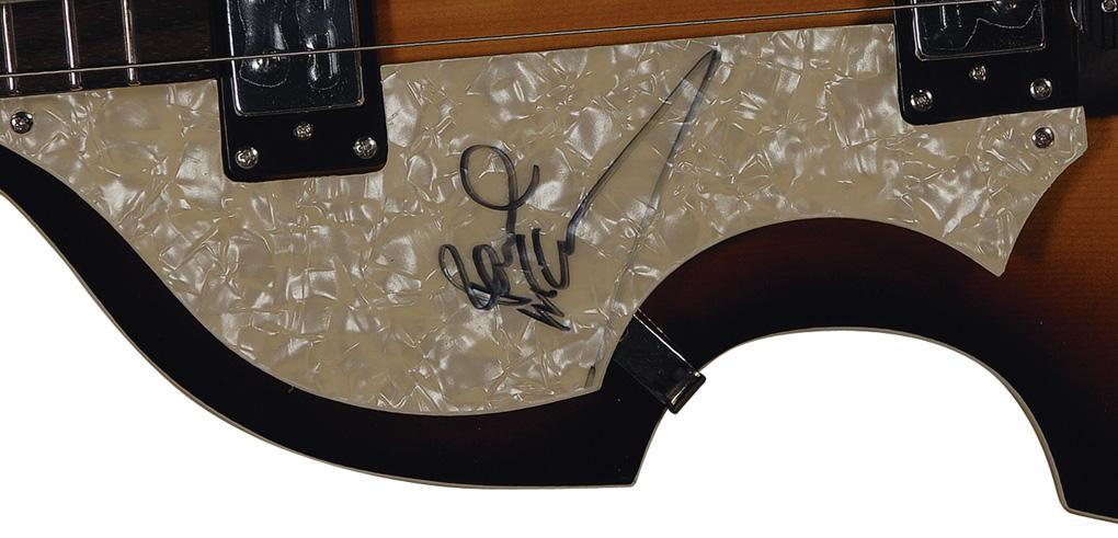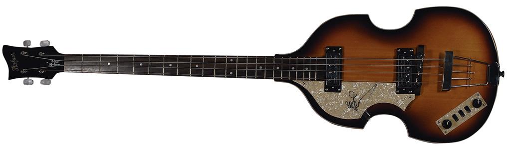 Beautiful left-handed sunburst-finish Höfner “violin” or “Cavern” B-Bass HI-Series bass guitar, beautifully signed on the imitation-mother-of-pearl pickguard in black felt tip “Paul McCartney.” In very fine condition. Accompanied by a letter of authenticity from noted Beatles expert Frank Caiazzo, in which he writes, ”This signature was obtained in person in Los Angeles, CA in 2004. Paul McCartney signed Höfner left-handed bass guitars are very rare and also extremely desirable.”
