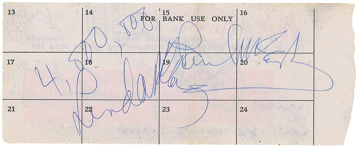 Ballpoint signatures, “Paul McCartney,” and “Linda McCartney,” on the reverse of a 7.25 x 3 page of a 1979 bank register, with Linda adding “4,000,000,” above her signature. Accompanied by another page from the register signed in ballpoint by Wings guitarist Laurence Juber. In very good condition, with a rough right edge, central vertical fold through one letter of Paul’s signature, and some scattered light toning.