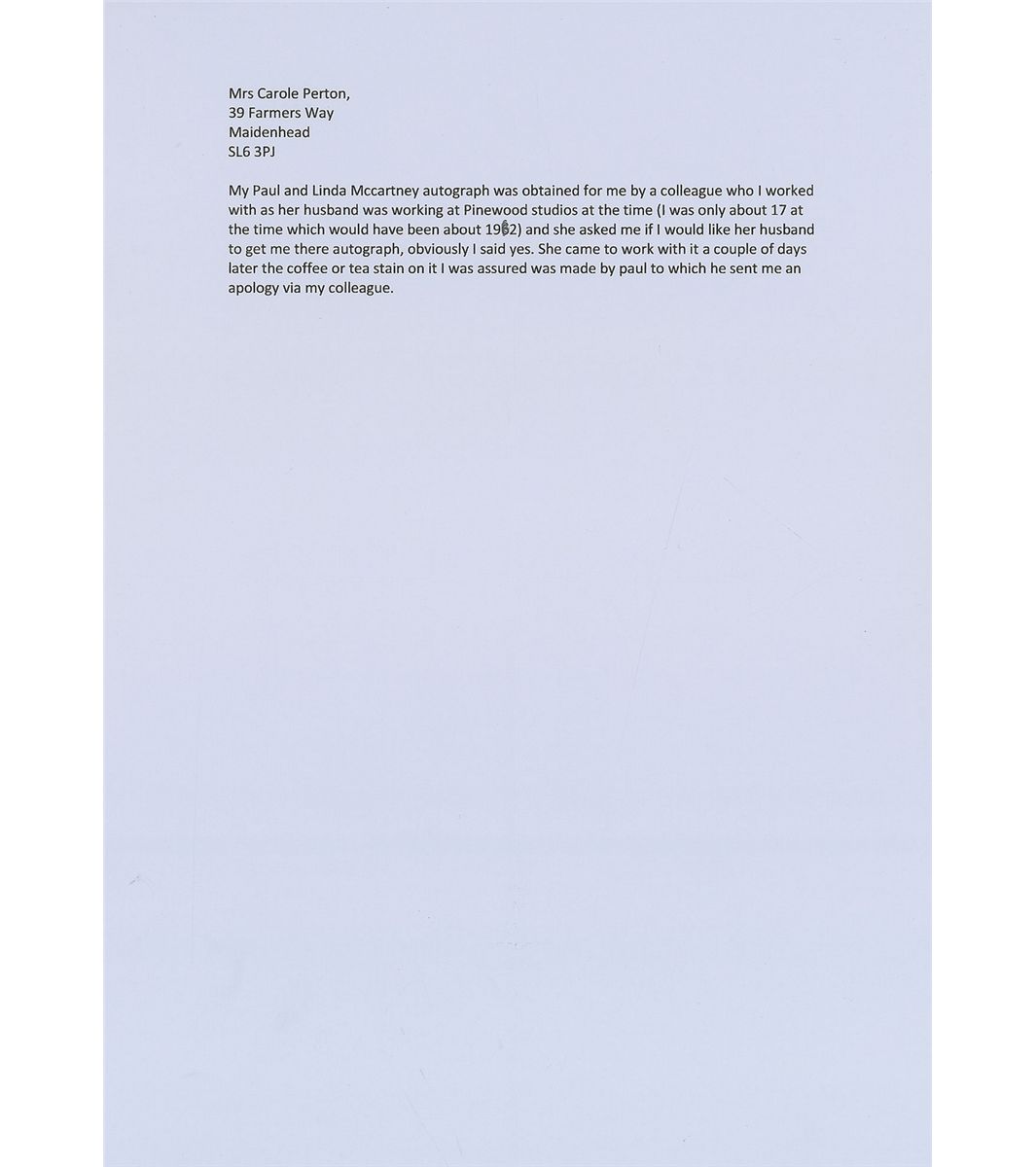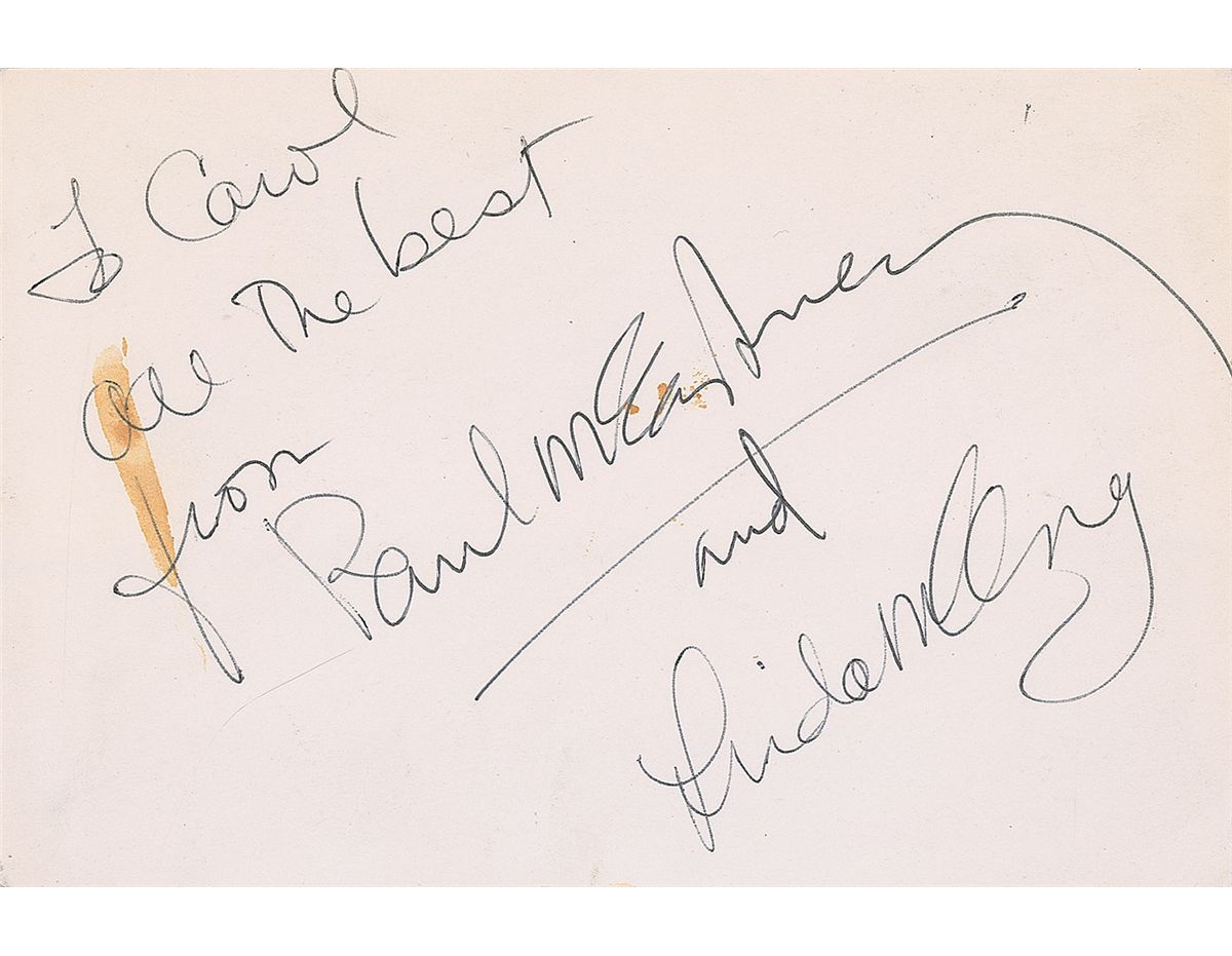 Ballpoint signatures and inscription, “To Carol, all the best, from Paul McCartney, and” and “Linda McCartney,” on an off-white 6 x 4 card. In very good condition, with light creases and stains affecting a portion of the inscription and a couple letters of Paul’s signature. Accompanied by a certificate of authenticity from Tracks. The signatures were obtained circa 1982 at Pinewood Studios.