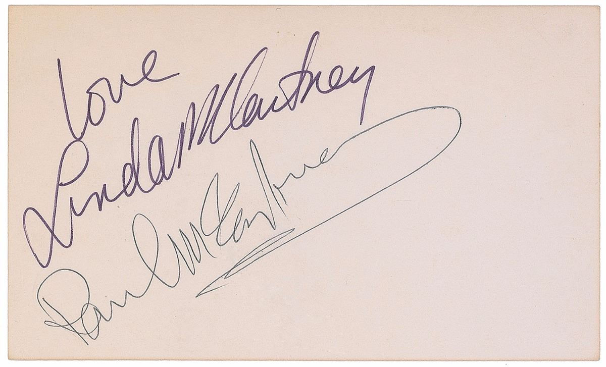Ballpoint and felt tip signatures, “Paul McCartney” and “Love, Linda McCartney,” on an off-white 5 x 3 card. In fine condition. Accompanied by a candid photo of the couple taken at the time of signing, with a collector’s notation on the reverse dating it to “Xmas week 1974, Stanhope Hotel, NYC.”