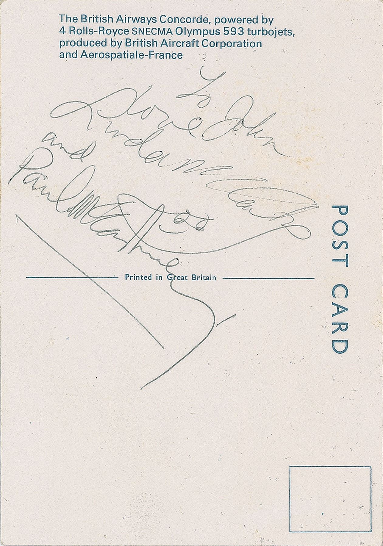 Ballpoint signatures and inscriptions, "To John, love, Linda McCartney" and "and Paul McCartney," with Linda adding a small smiley face on the reverse of a 6 x 4 postcard showing a British Airways Concorde. In very good to fine condition, with scattered light creasing. Consignor notes that the signatures date to the 1980s. Accompanied by a certificate of authenticity from Tracks and a letter of provenance from the sister of the original recipient, in part: "My brother John…worked for British Airways for over 30 years and during this time he was a steward on Concorde. The postcard was found among his effects when he died…My brother was a very funny person with a dry wit and I can only assume that the McCartneys appreciated this as he was unimpressed by celebrity and was unlikely to have requested an autograph. However, this obviously meant something to him as he kept it safe."