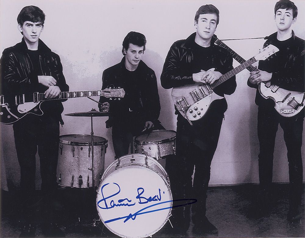 Glossy 14 x 11 photo of Best posing with John, Paul, and George, signed in blue felt tip by Best. In fine condition.
