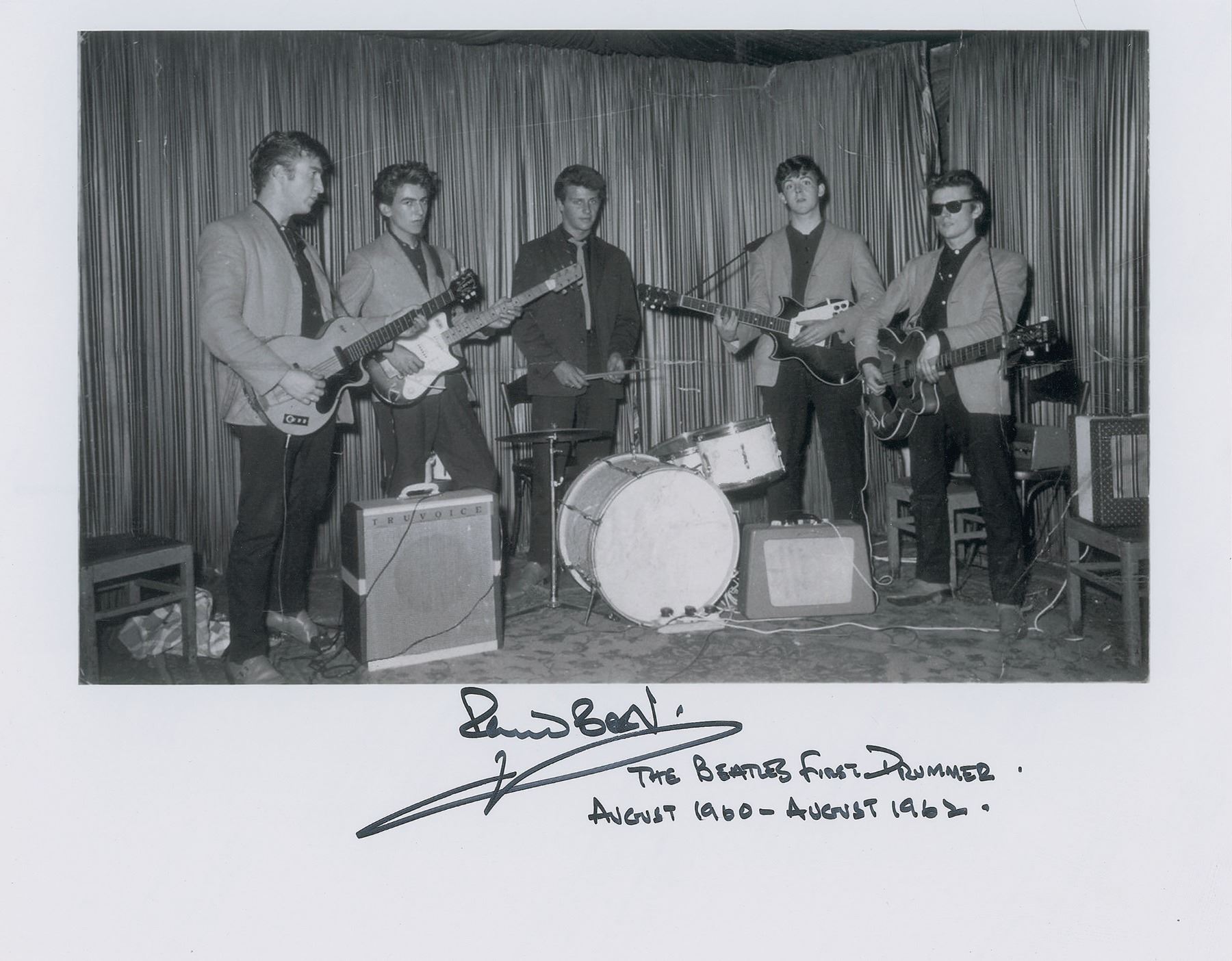 Satin-finish 14 x 11 photo of the Beatles in the early 1960s, with a lineup consisting of John Lennon, George Harrison, Paul McCartney, Stuart Sutcliffe, and Pete Best, with the latter signing in the lower border in black felt tip, "Pete Best, The Beatles first drummer, August 1960–August 1962." In fine to very fine condition.