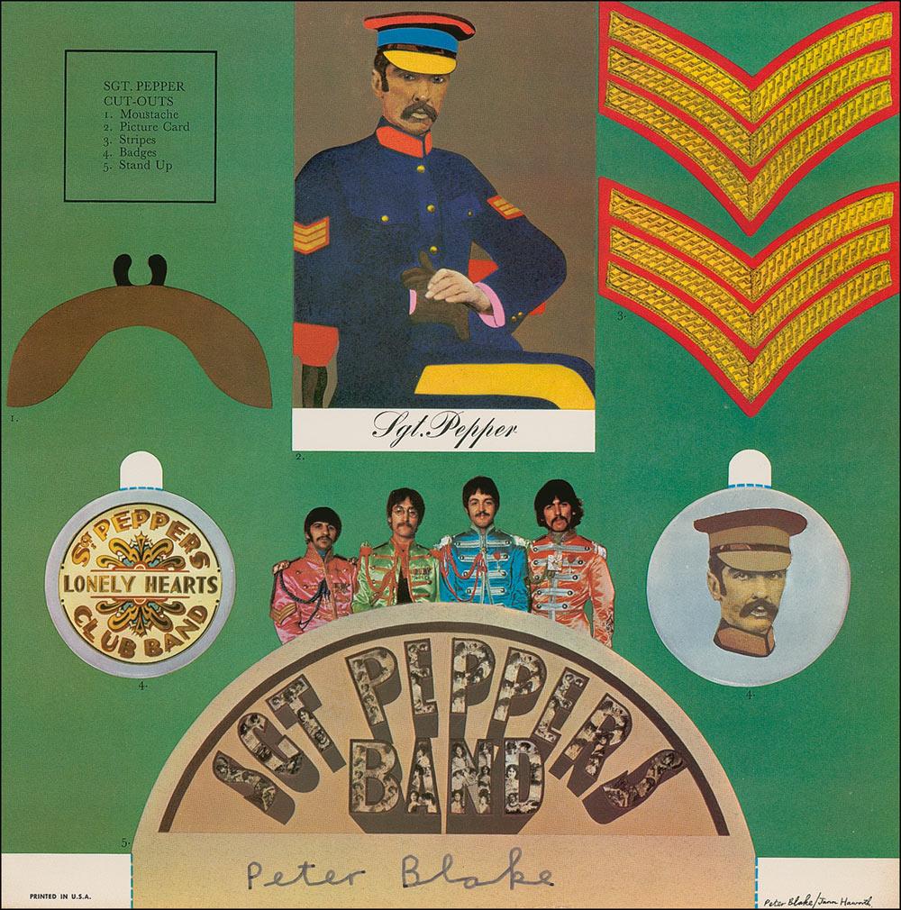 Sgt. Pepper’s album insert signed in black felt by Peter Blake, the album’s artist. In fine condition with a circular album impression.