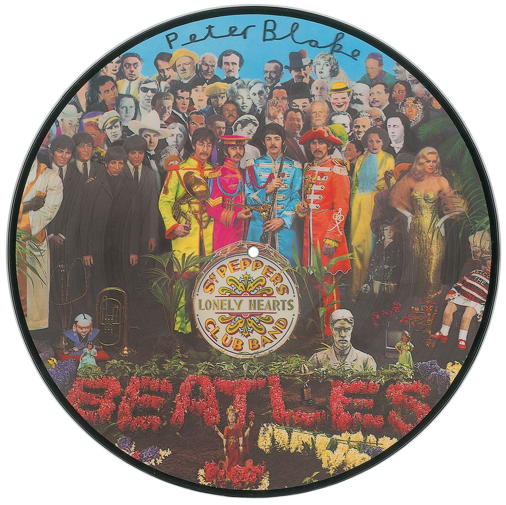 Attractive picture disc for the Beatles album Sgt. Pepper's Lonely Hearts Club Band, signed along the top in black felt tip by Peter Blake, the English pop artist who co-created the album sleeve design. In fine condition.