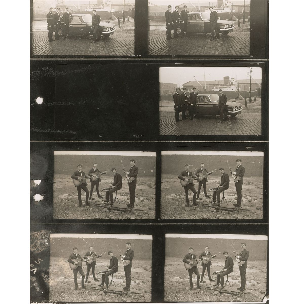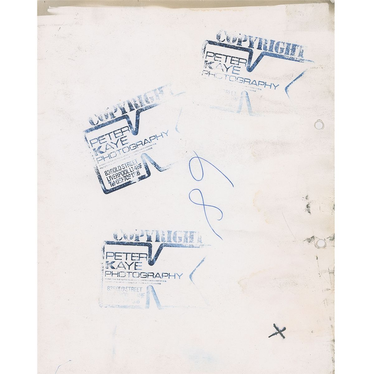 Original 1970s-1980s contact sheet. 7.75 x 10, of seven photos of the band taken by Kaye in late September of 1962. Reverse bears several Peter Kaye Photography stamps. In very good condition, with punch holes to left edge, scattered light creasing and rippling, and some discoloration to lower left of sheet. Photo originates directly from the archives of Peter Kaye Photography.