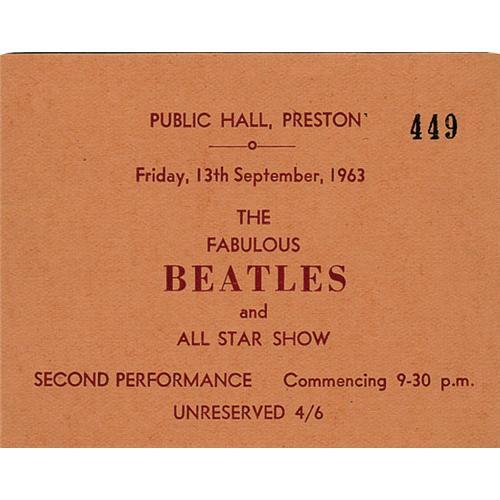 <B>Beatles Preston Concert Ticket.</B></I> A ticket for their September 13, 1963 performance at the Public Hall in Preston. After this show, Paul McCartney drove 25 miles to the Imperial Ballroom in Nelson to appear on a panel judging the "Imperial Miss 1963" contest. In Excellent condition with minimal wear.
