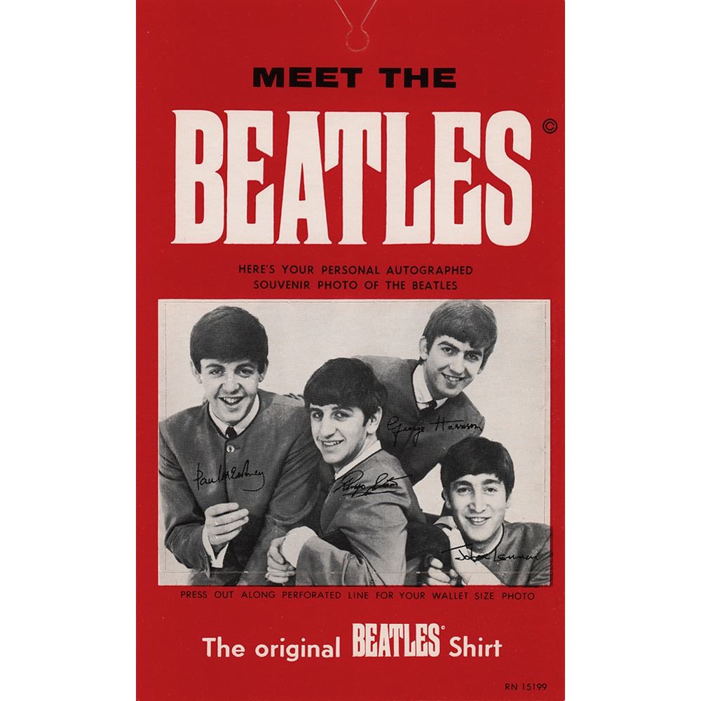 Unsigned vintage circa 1964 official 'Meet the Beatles' promo card hang tag for the "original Beatles Shirt," 4 x 6.5, featuring a small perforated image of the Fab Four bearing their facsimile signatures. In very fine condition.