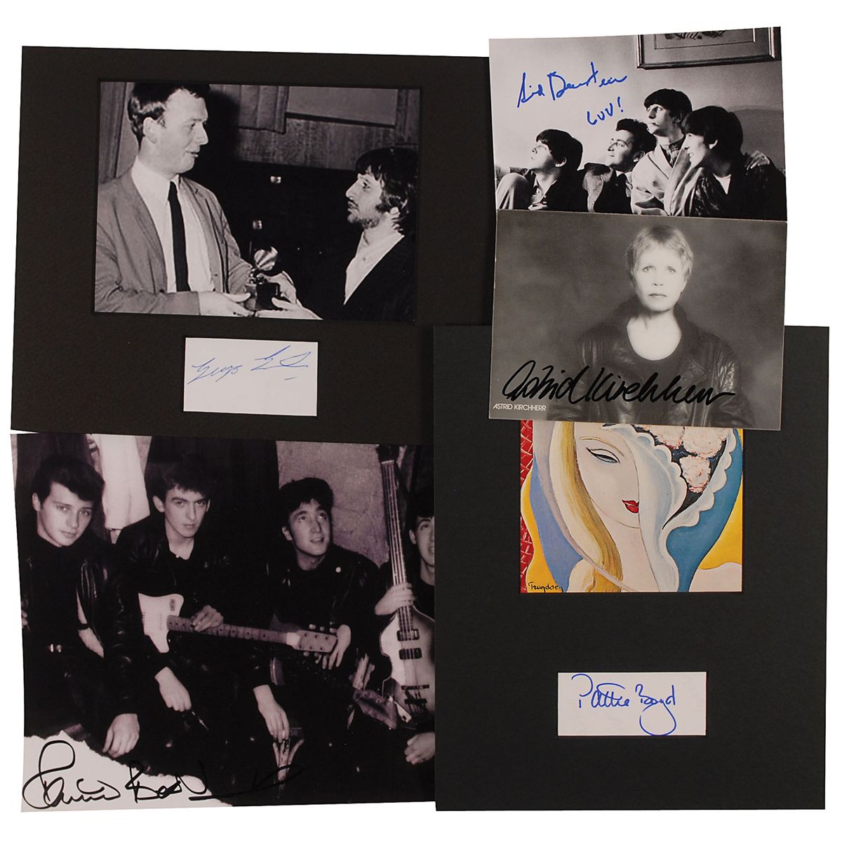 Five items: one glossy 10 x 8 photo of the band, signed in black felt tip by Pete Best; one 6 x 4.25 postcard photo of Astrid Kirchherr, signed at the bottom in black felt tip; one glossy 6 x 4 group photo, signed in blue felt tip by Sid Bernstein; one felt tip signature, “Pattie Boyd,” on a white 3 x 1.25 slip, matted with the cover image from Layla to an overall size of 8 x 10; and one ballpoint signature, “George Emerick,” on a white 2.75 x 1.5 card, matted with a photo to an overall size of 10 x 8. In overall fine condition.