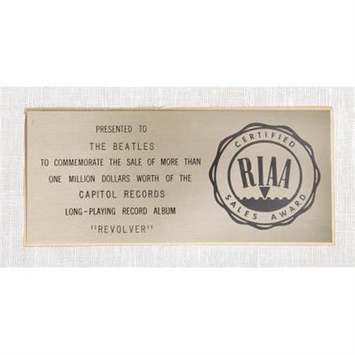<B>Beatles</B></I> <B><I>Revolver</B></I></B></I> <B>RIAA Gold Album Award.</B></I> Presented to the Beatles by the RIAA to commemorate the sale of $1 million worth of their groundbreaking 1966 album. The band's seventh studio recording, <I>Revolver</B></I> marked their entrance into psychedelia, as well as George Harrison's emergence as a songwriter with his contributions to three tracks. It's often cited as one of the greatest albums in pop music history, consistently ranking in the top five of various "Greatest Album" lists and has (to date) gone platinum five times. In Excellent condition, framed to an overall size of 17" x 21".<BR><BR><b>Shipping:</b> Framed - with Glass, Medium (<a target="_blank" href="http://www.heritageauctions.com/common/shipping.php">view shipping information</a>)