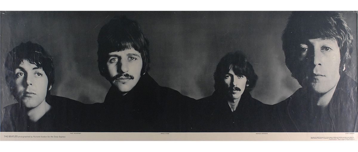 A complete set of four psychedelic individual portrait posters, all done by Avedon, as well as the bonus group banner poster. Commissioned in 1968 by the Daily Express newspaper, the individual posters measure 19 x 27, with the group poster measuring 40 x 14.5. Rolled and in fine condition, with pinholes to corners and a few scattered light creases.