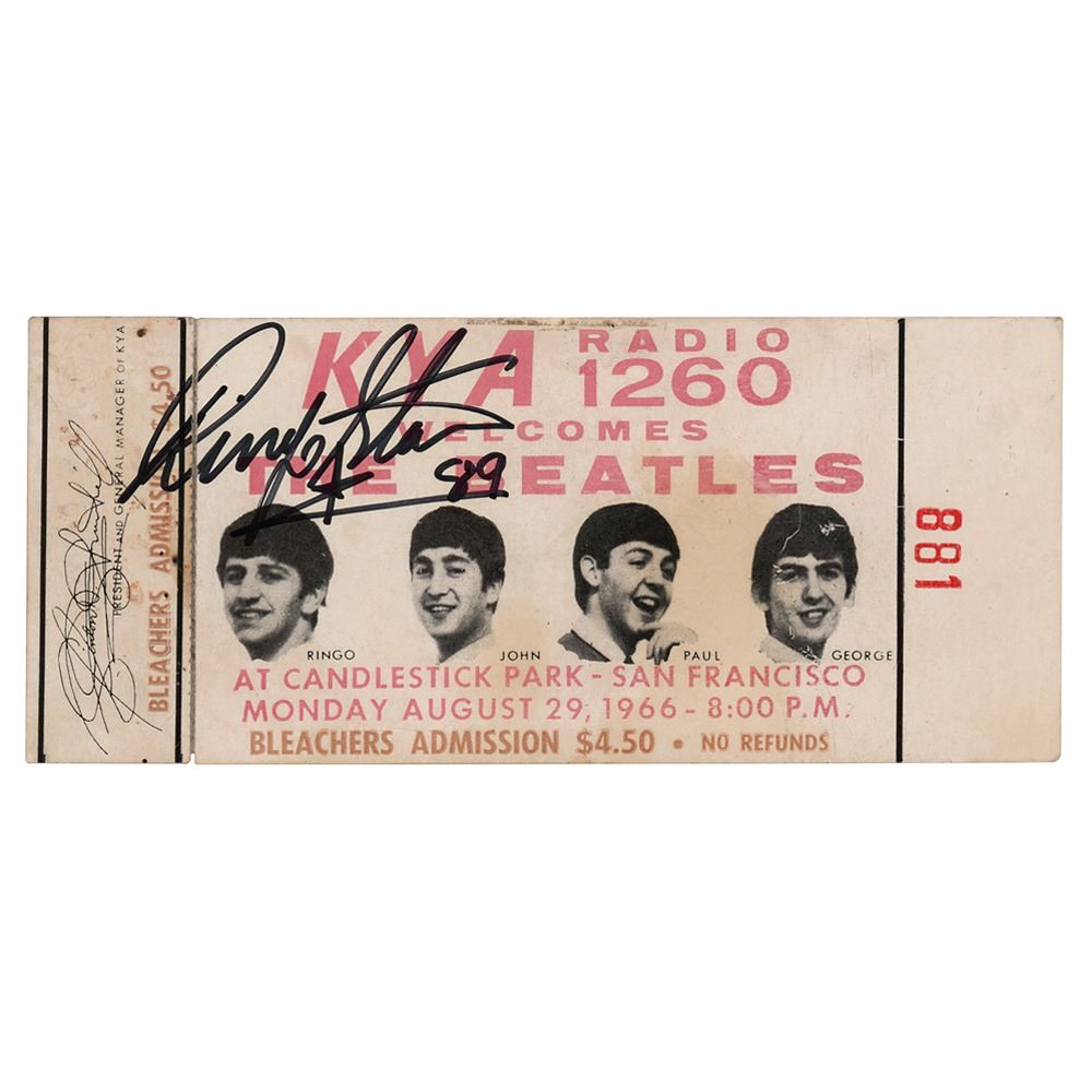 Original complete concert ticket for the Beatles’ performance at Candlestick Park in San Francisco, California, on August 29, 1966, 5.75 x 2.5, signed in black felt tip by Ringo Starr, who adds “89.” The vivid ticket reads, "KYA Radio 1260 Welcomes The Beatles," and features 'floating head' images of Ringo, John, Paul, and George. The ticket is for the “Bleachers” and is numbered “881.” In very good to fine condition, with light staining and creasing, and the signature partially over the stub, which is held in place with tape on the back. This was the band’s very last scheduled live concert, though they would appear unannounced for their famed ‘rooftop’ show in 1969. Accompanied by a certificate of authenticity from Tracks.