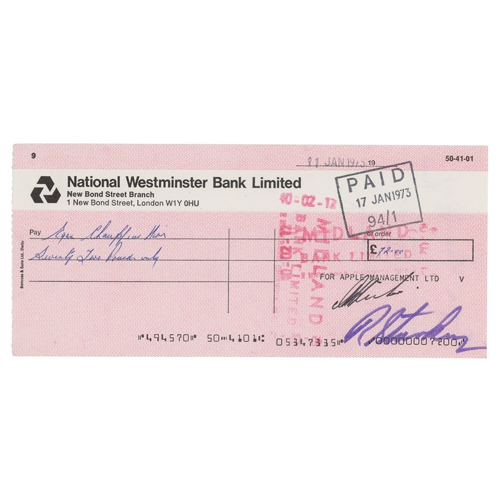 Apple Management Ltd. business check, 8 x 3.5, filled out in another hand and signed by Ringo Starr, "R. Starkey," payable to Egan Chauffeur Hire for £72, January 11, 1973. In fine condition. Accompanied by a certificate of authenticity from Tracks.