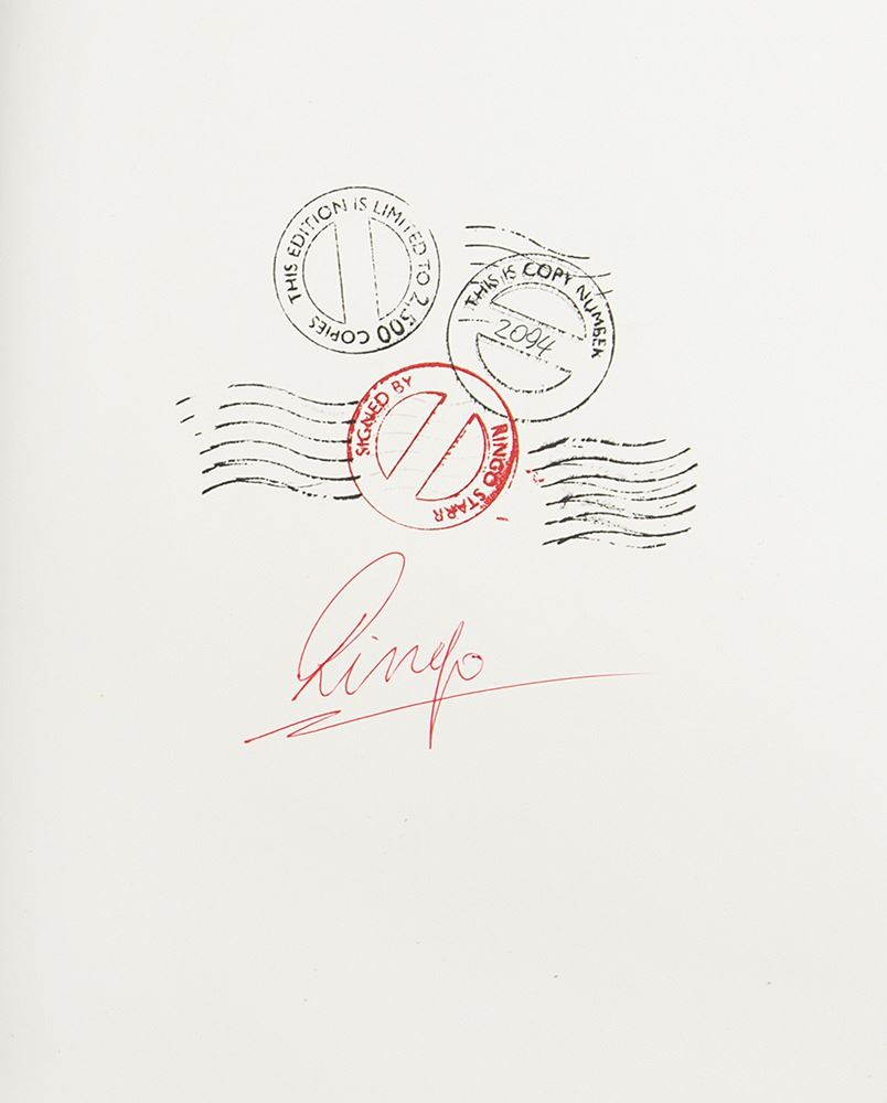 Signed book: Postcards from the Boys. Limited first edition numbered 2094/2500. England: Genesis Publications, 2003. Leather-bound hardcover with metal case, 11.25 x 11.75, 112 pages. Signed on the colophon in red ink, "Ringo." In fine condition, with dings and scuffs to the covers. This gorgeous edition features fifty-three facsimile reproductions of postcards sent by George Harrison, John Lennon, and Paul McCartney to Ringo, supplemented with Starr's own humorous commentary.