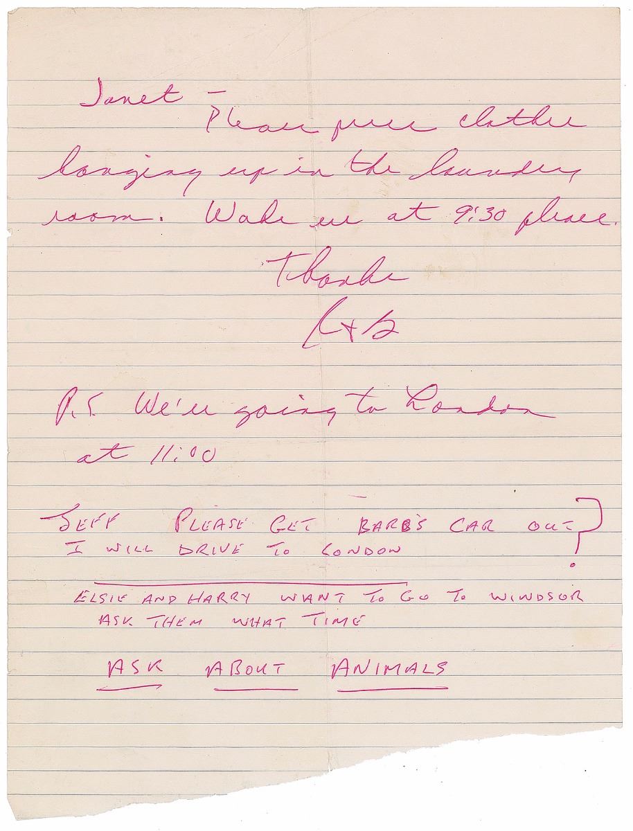 Handwritten notes from Ringo Starr and wife Barbara Bach on an off-white 8 x 10.5 sheet, one page, lightly lined, no date. In red ballpoint, Starr writes in the lower portion: "Jeff, Please get Barb's car out? I will drive to London. Elsie and Harry want to go to Windsor, ask them what time. Ask about animals." Bach adds to the upper portion: "Janet—Please press clothes hanging u pin the laundry room. Wake us at 9:30 please. Thanks, R & B." In very good to fine condition, with intersecting folds and a missing lower right corner.