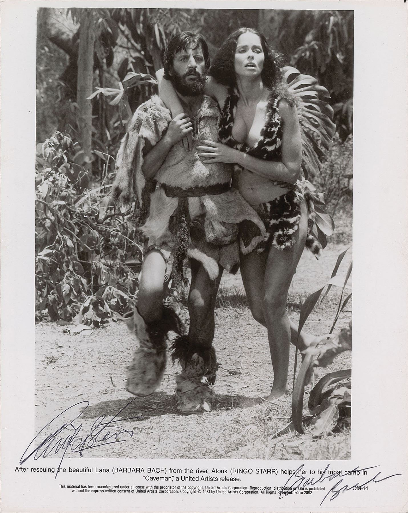 Glossy 8 x 10 United Artists publicity photo Ringo Starr as Atouk and Barbara Bach as Lana from the 1981 comedy Caveman, signed in black ballpoint by Starr and Bach. In fine condition, with light corner creases.