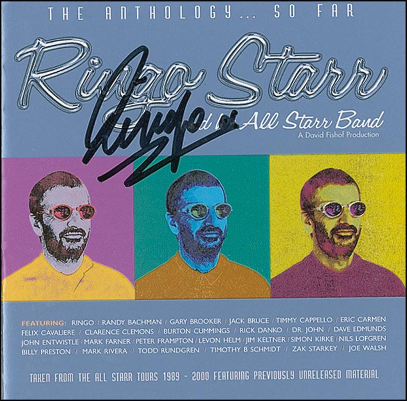 Ringo Starr The Anthology…So Far CD booklet signed on the front cover in black felt tip, “Ringo 01.” In very fine condition.