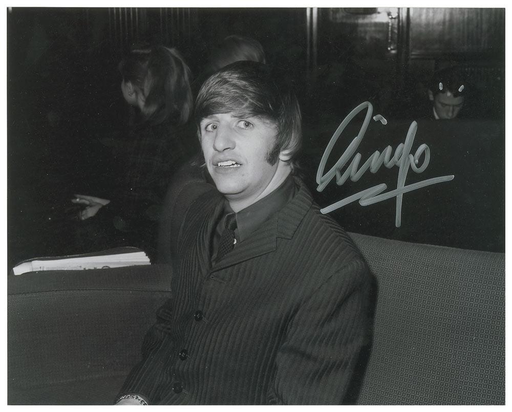 Glossy 10 x 8 photo of Starr sitting on a sofa, signed in silver ink, “Ringo.” In fine condition.
