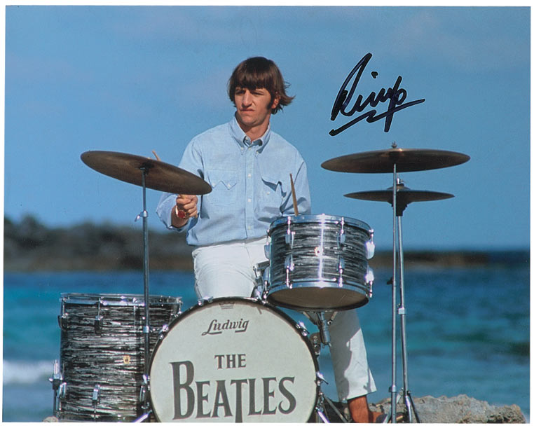 Color satin-finish 10 x 8 photo of Ringo drumming on the beach for the Beatles, signed in black felt tip, “Ringo.” In very fine condition.