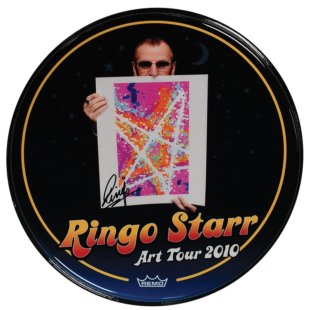 Promotional 14? photo Remo drumhead from Starr’s 2010 Art Tour, featuring an image of Starr holding up one of his works, signed in black felt tip, “Ringo.” In very fine condition. Accompanied by an unsigned color promotional poster for the tour.