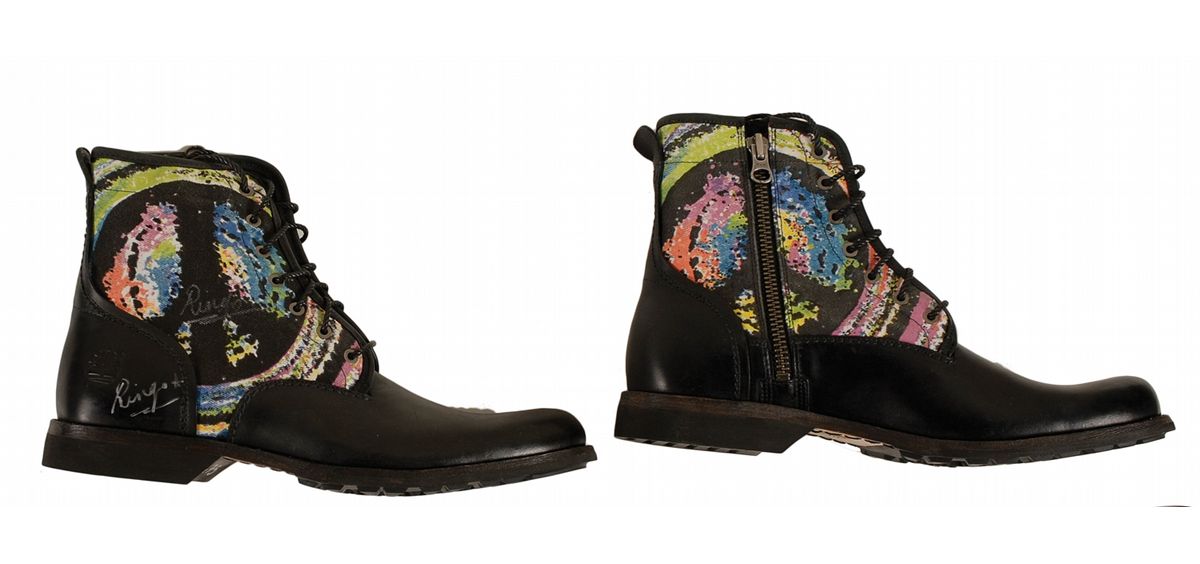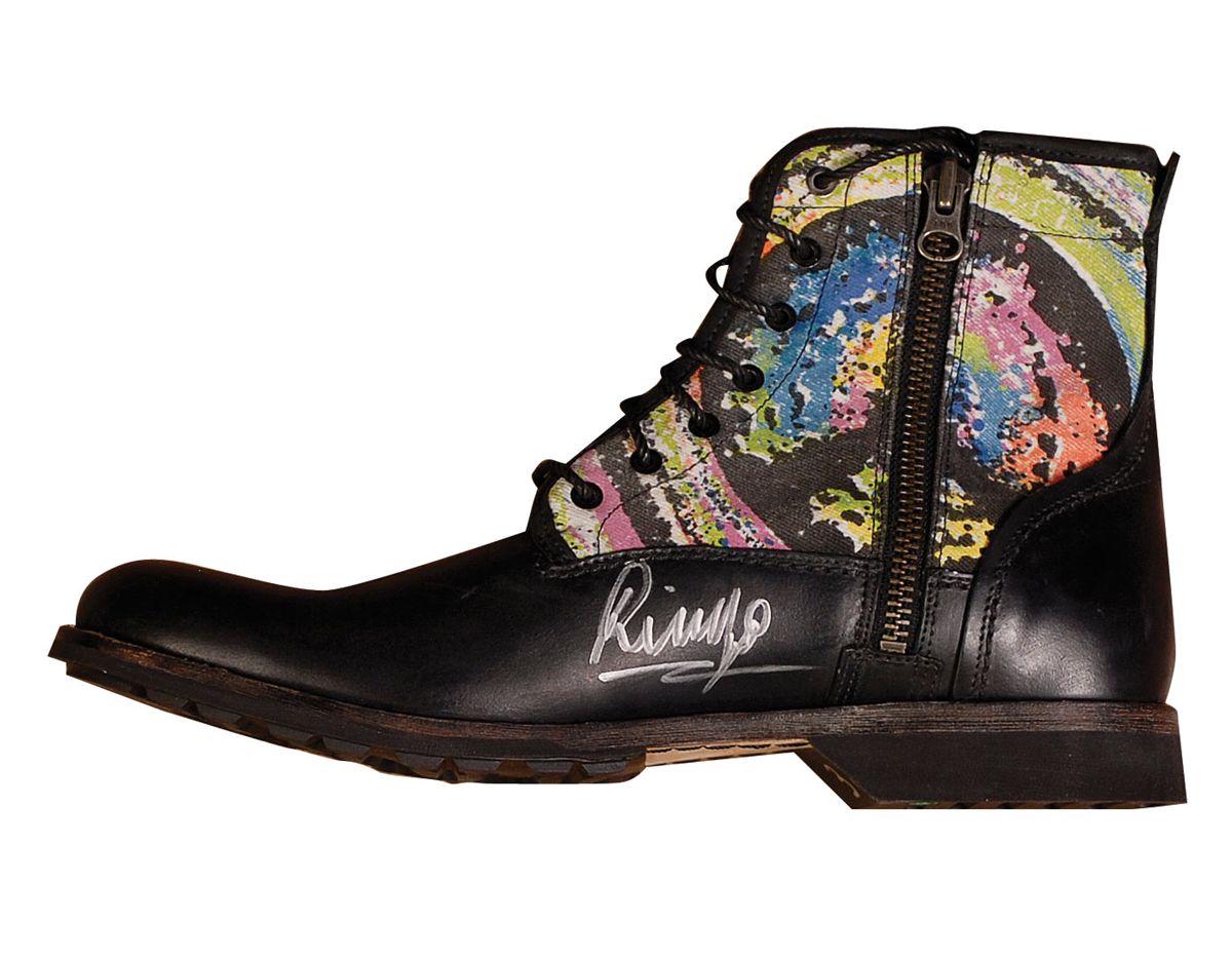 A pair of Timberland Earthkeeper 6? leather and colorful fabric side zip boots, one of 75 pairs signed by Starr for the Timberland WaterAid auction, signed three times on the side of the right-foot boot in silver ink, “Ringo,” twice on one side and once on the other. In fine condition. Accompanied by a letter of authenticity from Timberland and their original box. This particular pair was signed three times as #3 of the edition, and was the only pair signed more than once.