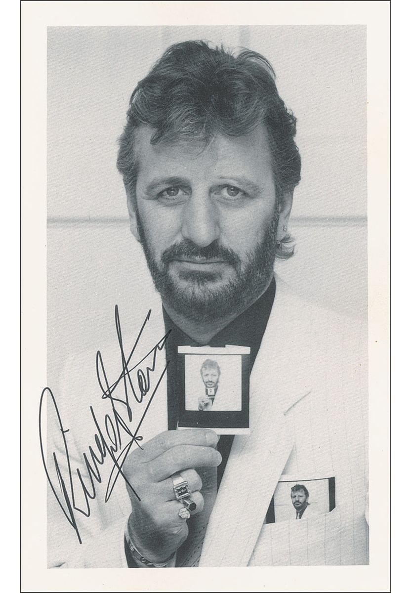 Matte-finish 3.5 x 5.5 cardstock photo of Ringo holding up a small photo of himself in the same striped suit, crisply signed in black felt tip. In very fine condition.