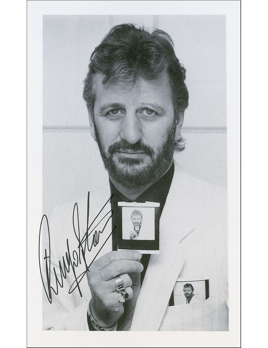 Cardstock 3.5 x 5.5 photo of Ringo holding a photo of himself holding a photo of himself, signed in black ink, “Ringo Starr.” In fine condition.