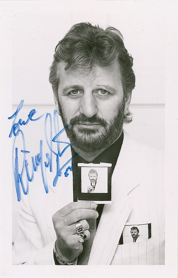 Satin-finish 3.5 x 5.5 photo of Ringo holding a similar photo, signed in blue felt tip, “Love, Ringo Starr.” In fine condition.
