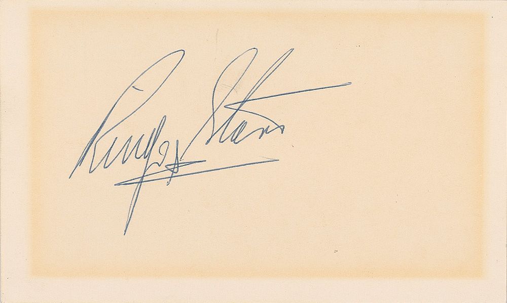 Ballpoint signature, “Ringo Starr,” on an off-white 5 x 3 card. A uniform block of light toning over signature, otherwise fine condition.