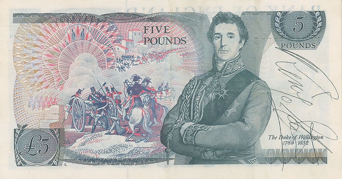 Bank of England five pound note, signed vertically on the reverse in black ballpoint, “Ringo Starr.” Overall creases from circulation, otherwise fine condition. Accompanied by a certificate of authenticity from Tracks.