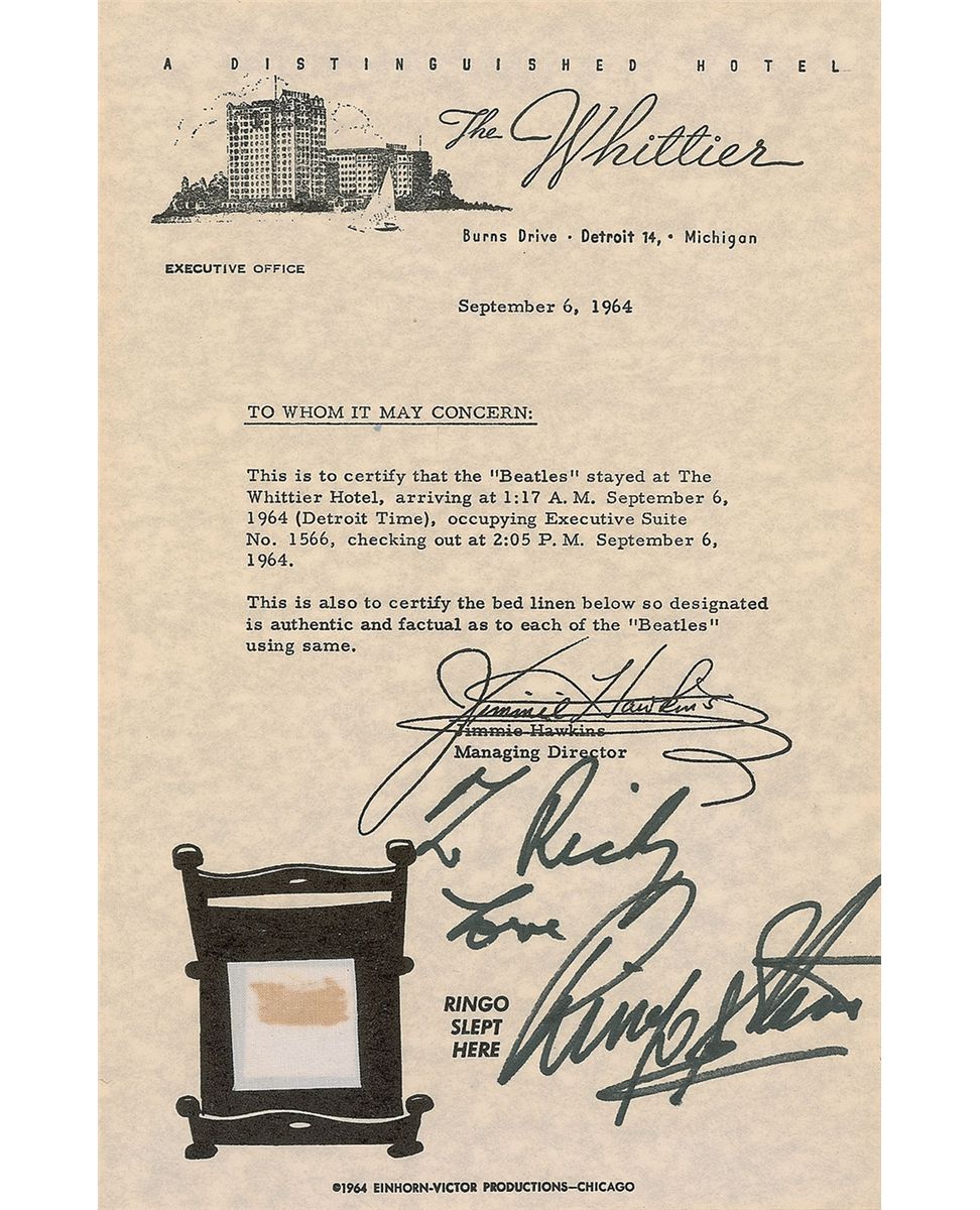 Original 1 x 1 swatch of bed linen from the Beatles’ stay at the Whittier Hotel on September 6, 1964, affixed to a 5.75 x 9 descriptive certificate, signed and inscribed on the certificate in black felt tip, “To Richy, Love, Ringo Starr.” Printed to the right of the swatch are the words, “Ringo slept here.” In fine condition. The autograph was purchased from the nephew of Richy Victor of Einhorn-Victor productions, the company that originally purchased the used sheets. Accompanied by a certificate of authenticity from Tracks.