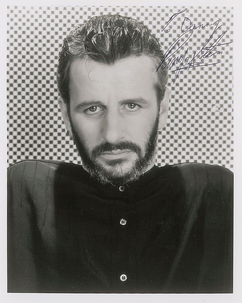 Circa early 1980s glossy 8 x 10 head-and-shoulders photo, signed and inscribed in black ballpoint, “To Danny, Ringo Starr.” In fine condition, with a diagonal crease to the lower left. Accompanied by a certificate of authenticity from Tracks.