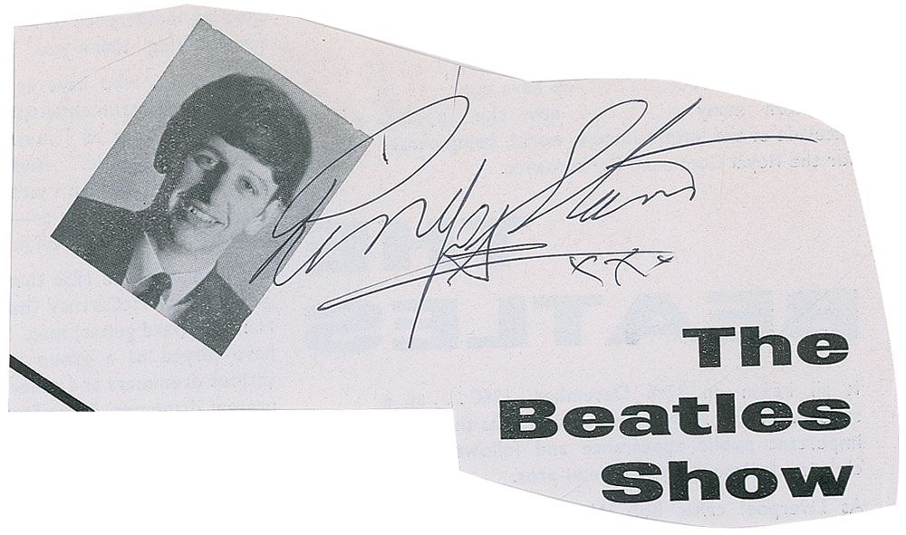 Vintage ballpoint signature, “Ringo Starr, xxx,” on an off-white 5.5 x 3 slip clipped from a 1963 Beatles UK tour program, featuring a small portrait of Ringo on the left side. In fine condition, with irregularly clipped edges.