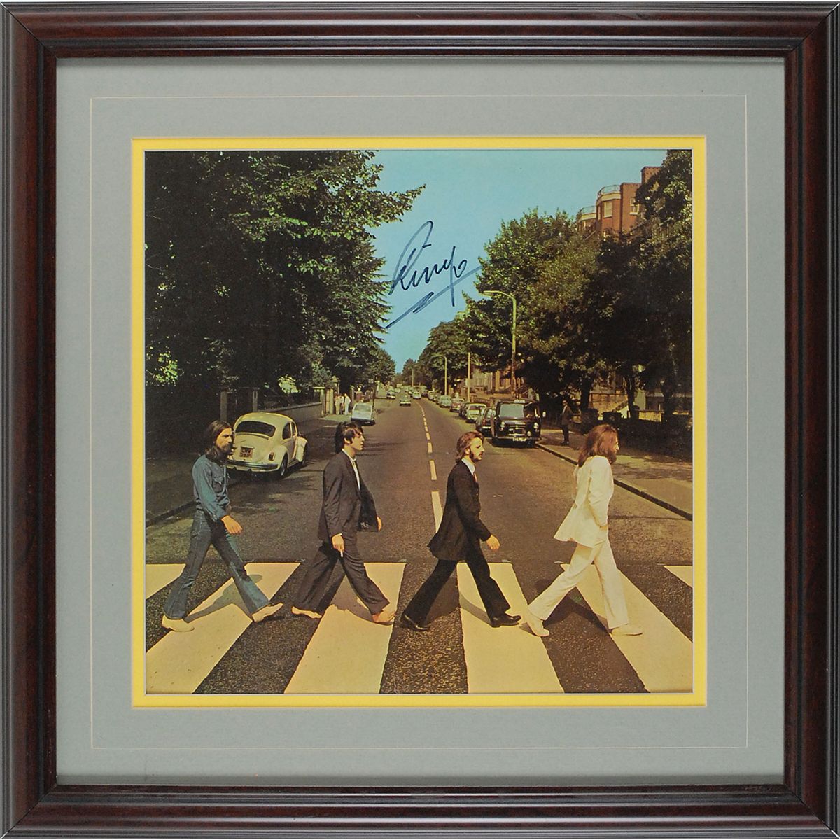 Abbey Road album signed on the front cover in black felt tip, “Ringo.” Double-matted and framed to an overall size of 18.25 x 18.25. In fine condition, with a few scattered light edge creases.