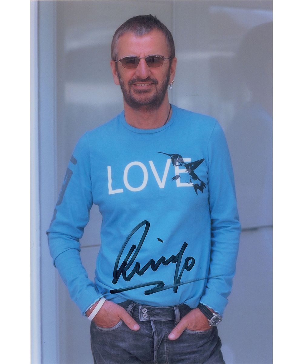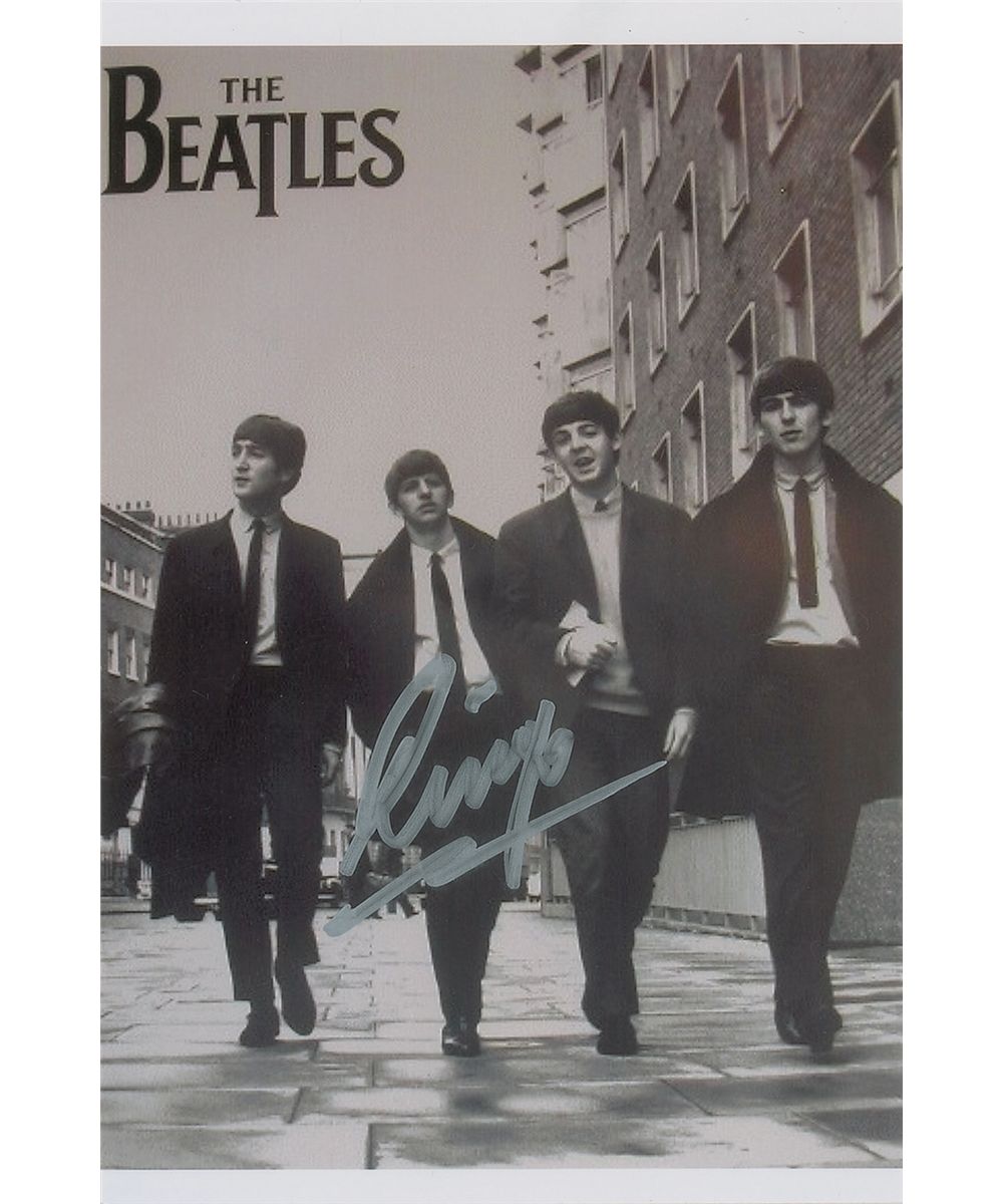 Two signed 4 x 6 photos: a glossy photo of the Beatles walking down a street, signed in silver ink, “Ringo”; and a color satin-finish photo, signed in black felt tip, “Ringo.” In very fine condition.