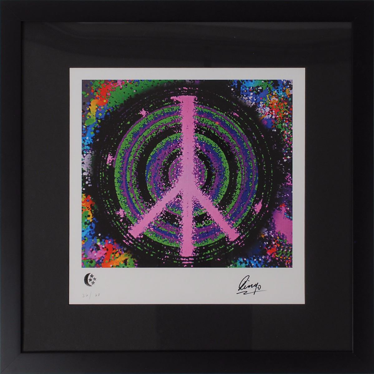 Color limited edition 14 x 14 giclee print entitled ‘Pink Peace,’ numbered 26/60, signed in the lower border in black felt tip, “Ringo.” Beautifully archivally matted and framed. In fine condition. An especially desirable example given the artwork’s connection to the counterculture of the 1960s. Oversized.