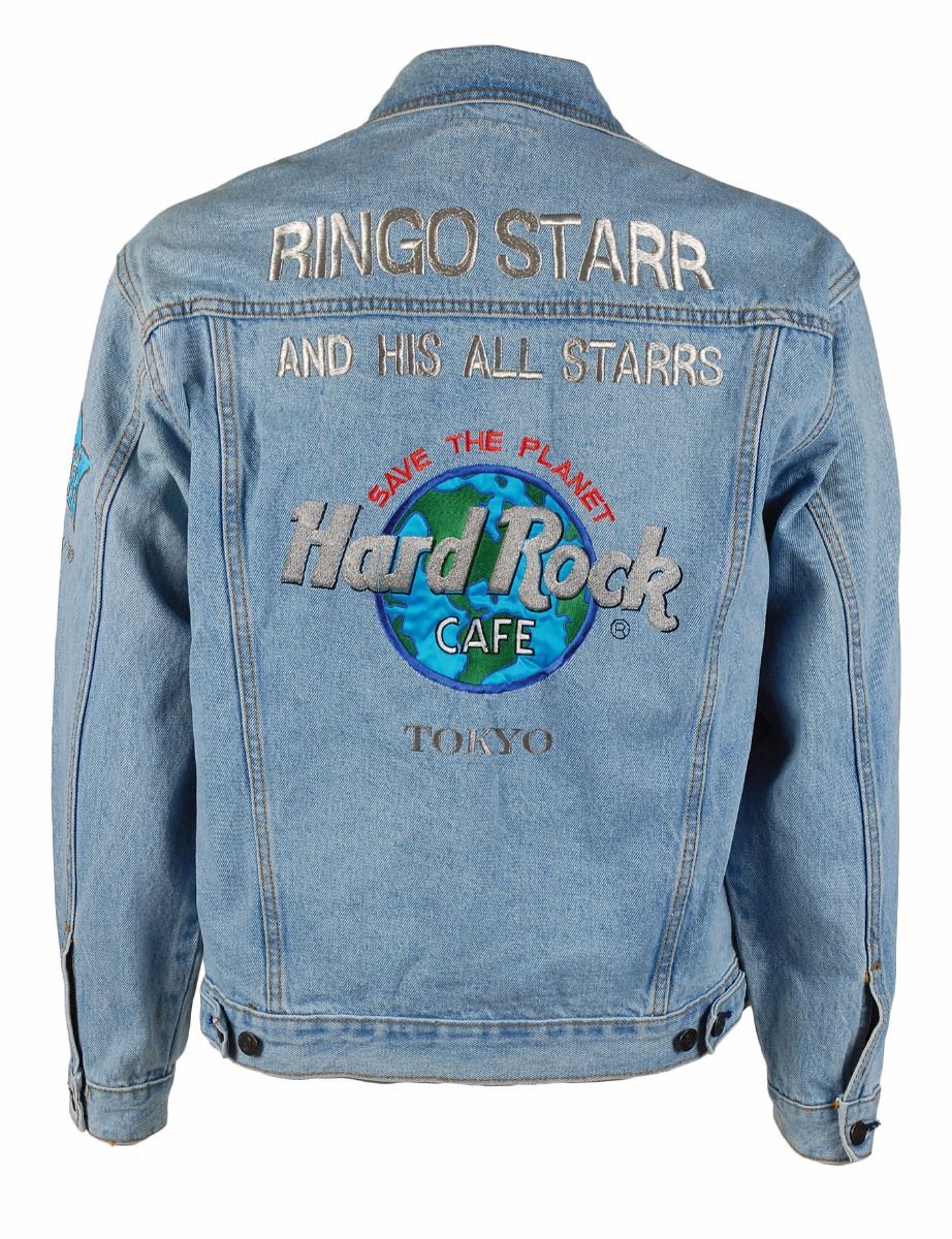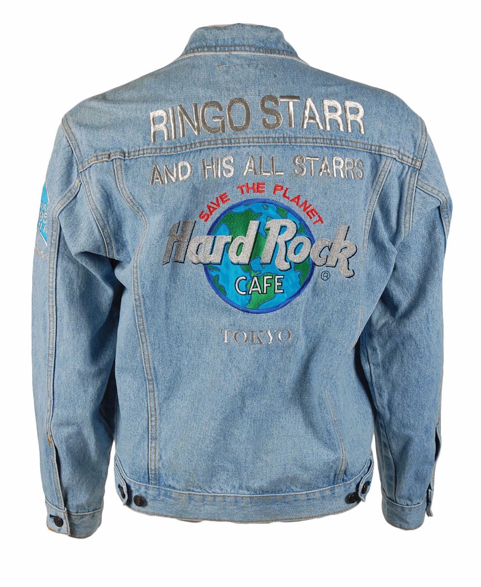 Pair of customized Hard Rock Cafe tour jackets personally owned by Ringo Starr and Barbara Bach. The light denim jackets are from the Japan leg of the 1995 tour of Ringo and His All-Starr Band and feature the Hard Rock Cafe logo on the back, embroidered in silver “Ringo Starr and His All Starrs” across the shoulders and “Tokyo” below. Ringo’s jacket is a size medium and personalized below the tour patch on the left sleeve, “Ringo”; Bach’s is size small and personalized in the same area, “Barbara.” In overall fine condition. Originally acquired from the ‘Property Of Ringo Starr And Barbara Bach’ Auction in Beverly Hills.