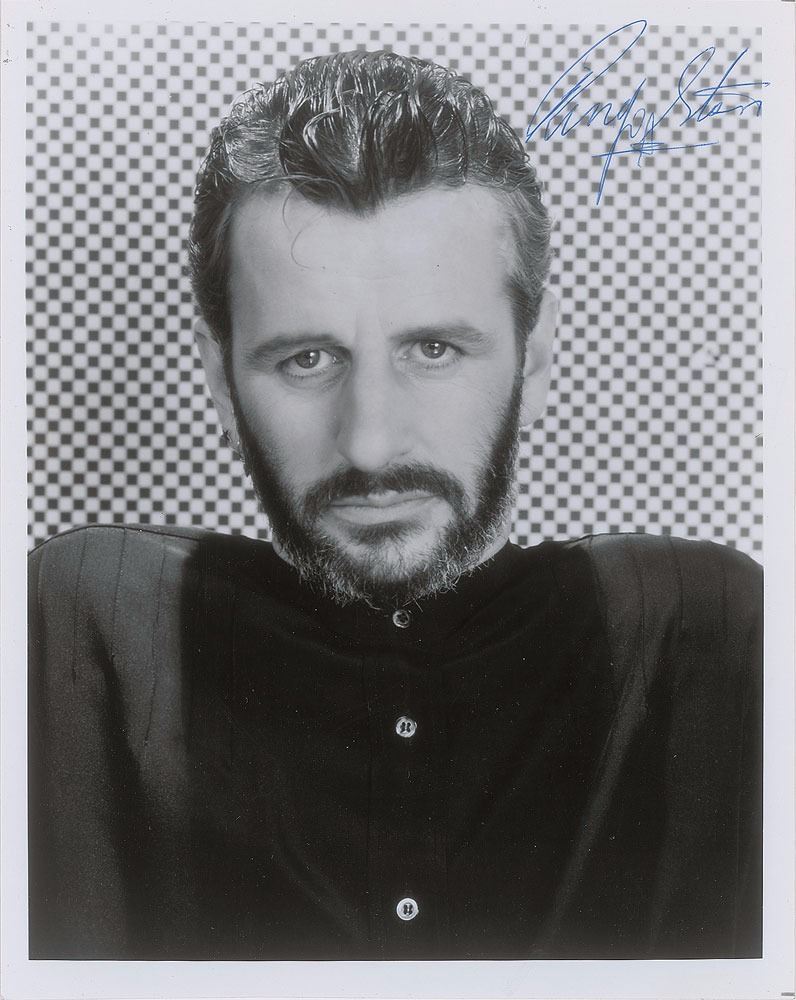 Glossy 8 x 10 photo of Ringo posing against a checkered background and staring directly into the camera, signed in blue ballpoint. In fine condition.