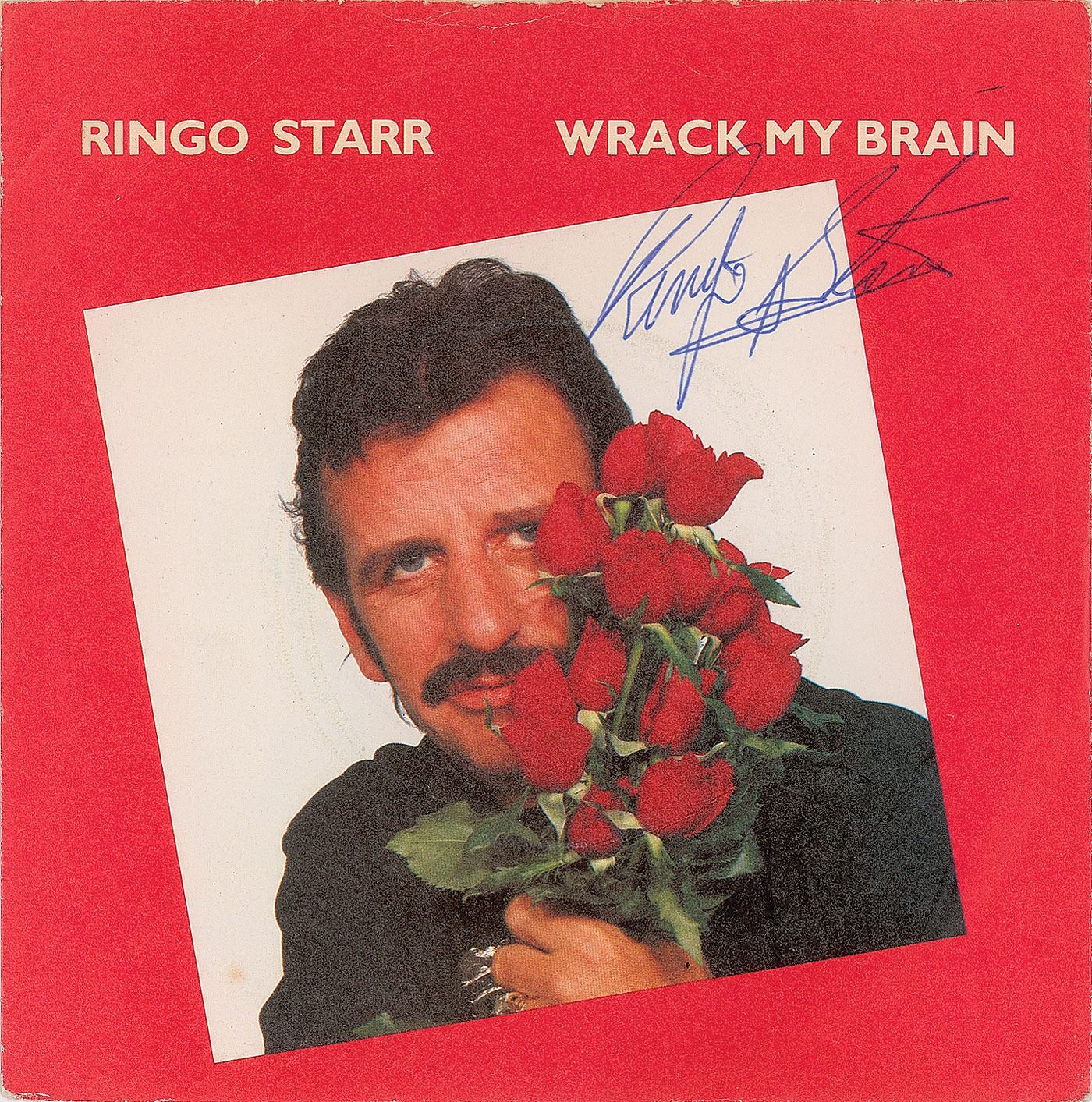 RCA Records 45 RPM single record for 'Wrack My Brain / Drumming Is My Madness,' signed on the front of the sleeve in blue ballpoint by Starr. In fine condition. The record is included. Consignor notes that the signature dates to the mid-1980s. Accompanied by a certificate of authenticity from Tracks.