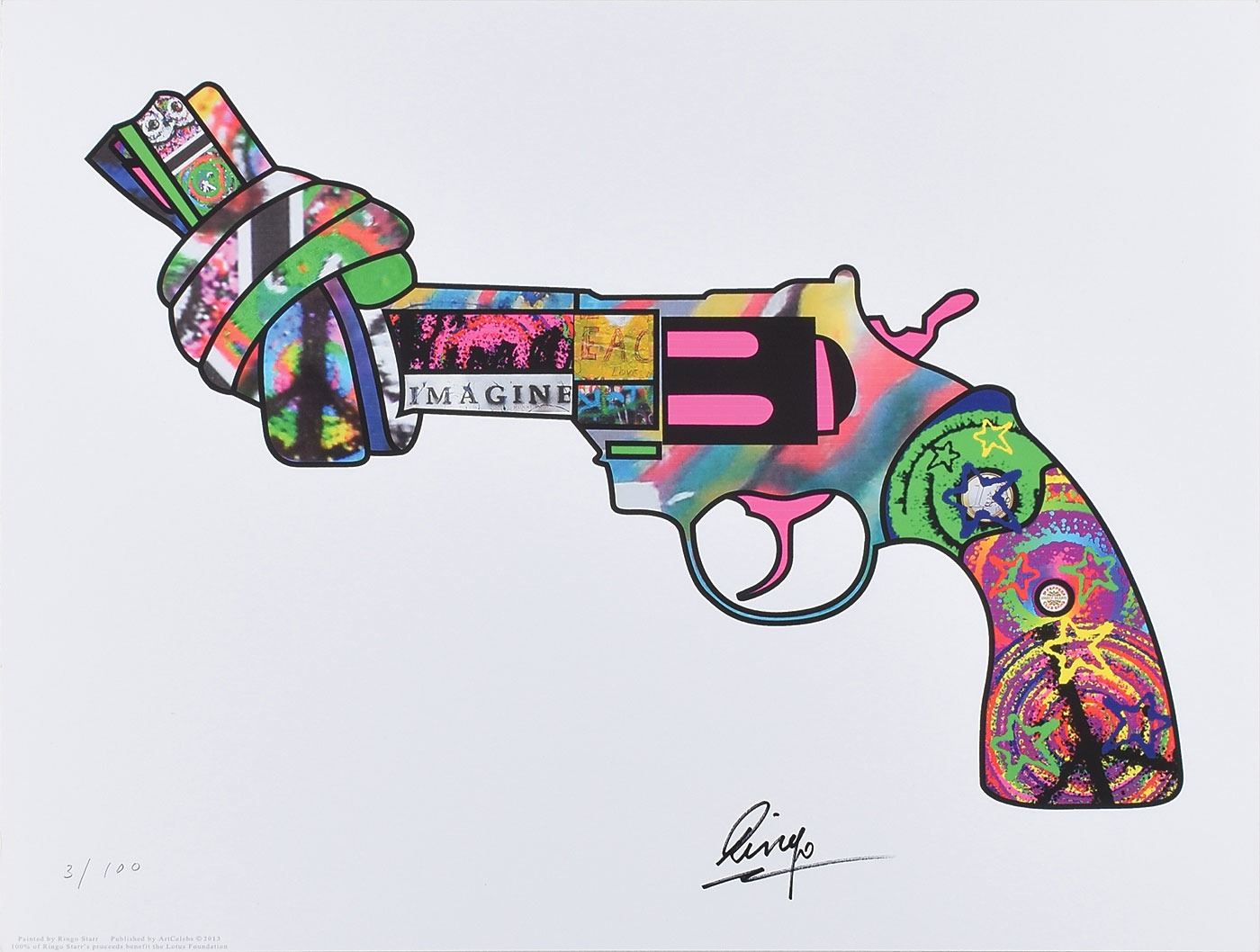 Color limited edition 18 x 13.5 giclee print entitled 'Right Gun (Knot for Violence),' numbered 3/100, signed at the bottom in black felt tip, "Ringo." Ringo's limited edition print advocating anti-violence is a tribute to his best friend and bandmate John Lennon. Notice how Ringo has placed the word 'Imagine' in the barrel of the gun and included a tiny Sgt. Pepper logo in the grip. A perfect art piece from the world's biggest advocate for peace and love. In very fine condition.