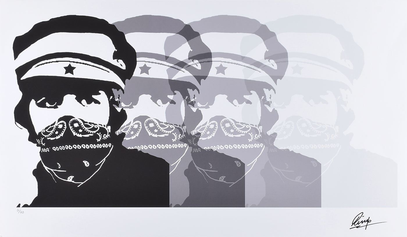Limited edition 27.5 x 16 giclee print entitled '4 Ringos,' numbered 6/60, signed in the lower right in black felt tip, "Ringo." Ringo’s artwork has often been compared to Andy Warhol and this does nothing to dispel that comparison. Using a stencil Ringo himself cut-out, he shows his 'Beatle 65' self that changed the world and helped start the pop movement. This is a classic pop artwork produced by a Beatle. In fine condition.