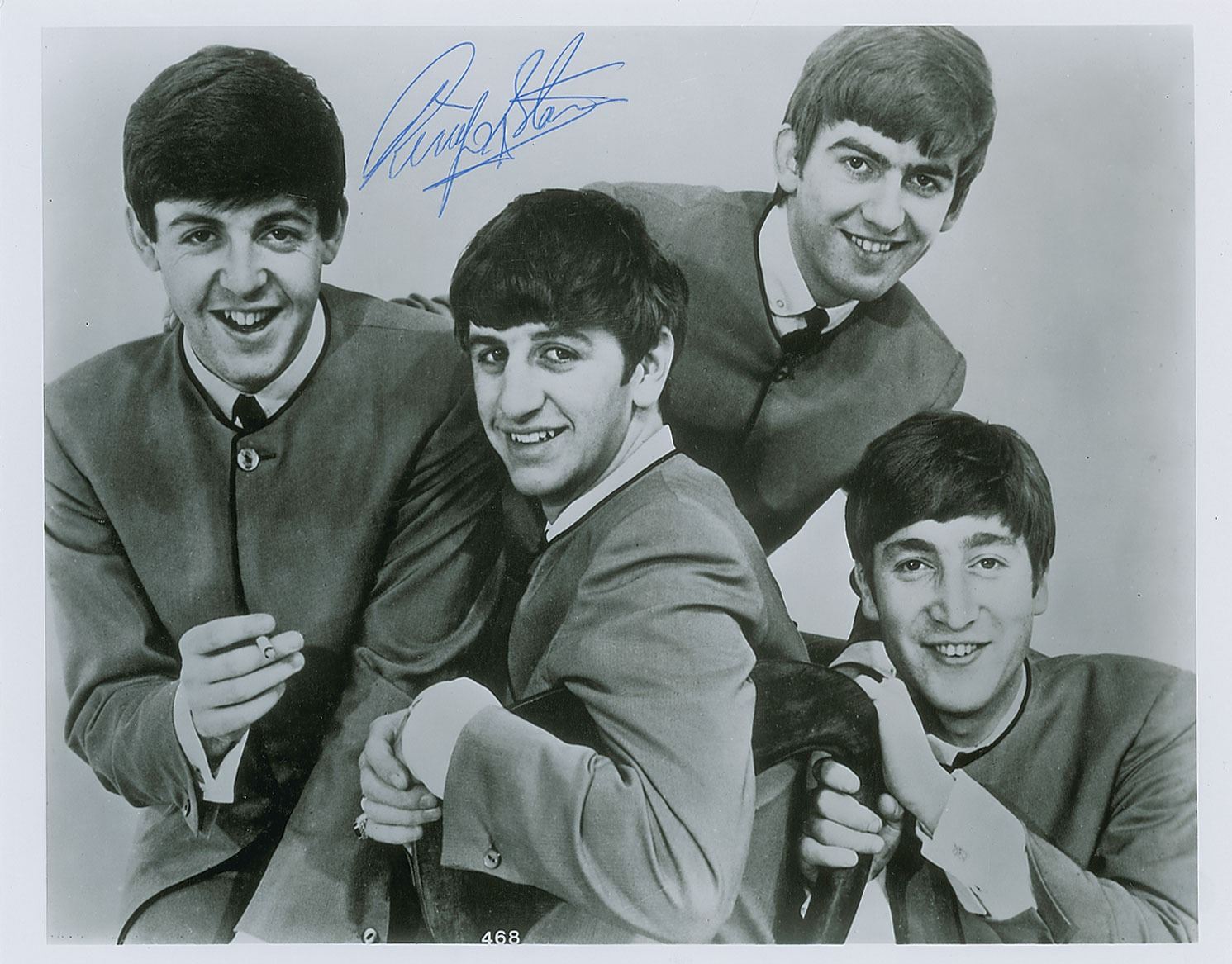 Glossy 10 x 8 photo of the Beatles wearing matching collarless suits during a Dezo Hoffman photo shoot, signed in blue ballpoint by Ringo Starr. In fine condition.