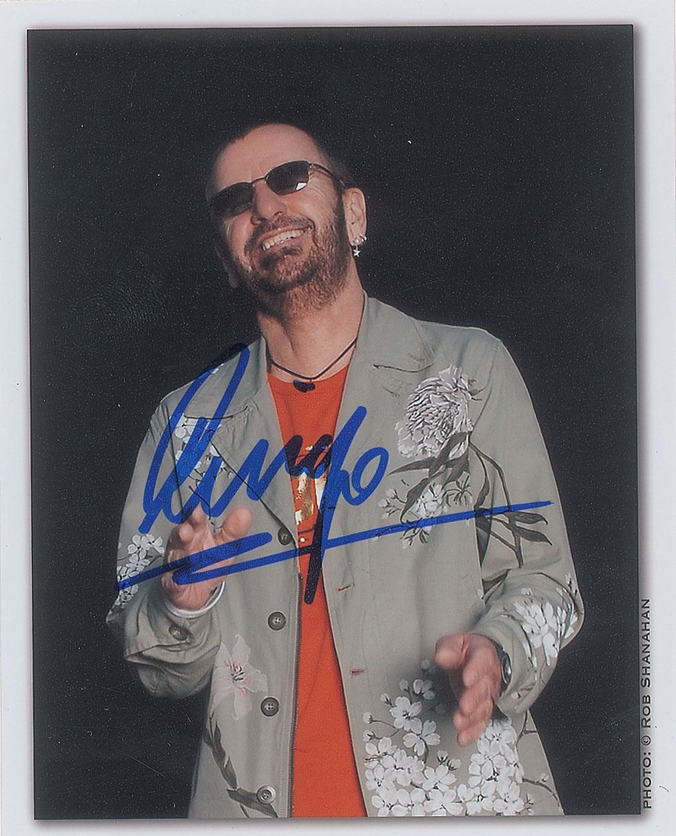 Color satin-finish 4 x 5 half-length photo of Starr in a jubilant mood wearing sunglasses and a floral pattern shirt, signed in blue felt tip, "Ringo." In very fine condition. Accompanied by a certificate of authenticity from Tracks.