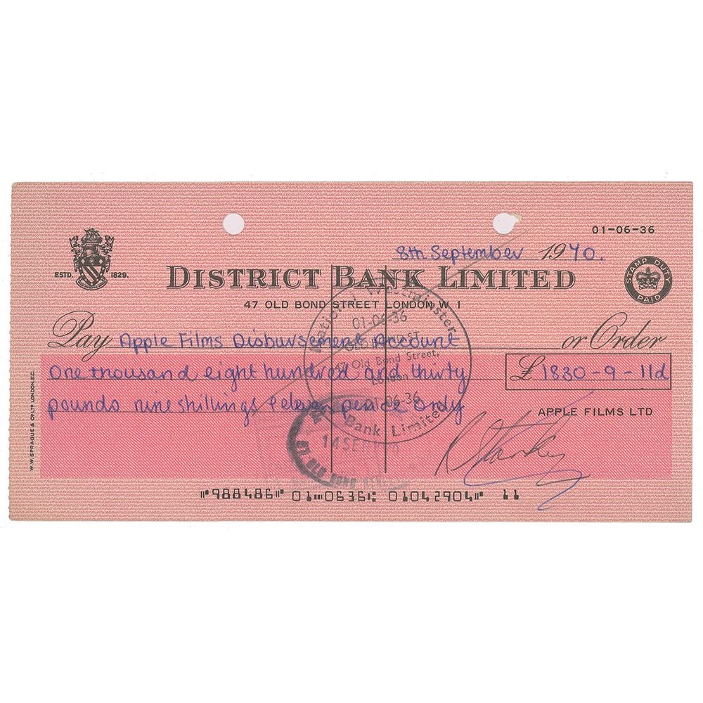 Apple Films Ltd business check, 8 x 4, filled out in another hand and signed by Ringo Starr, "R. Starkey," payable to Apple Films Disbursement Account for £1830.9.11, September 8, 1970. In fine condition, with two punch holes to the top edge. Accompanied by a certificate of authenticity from Tracks.