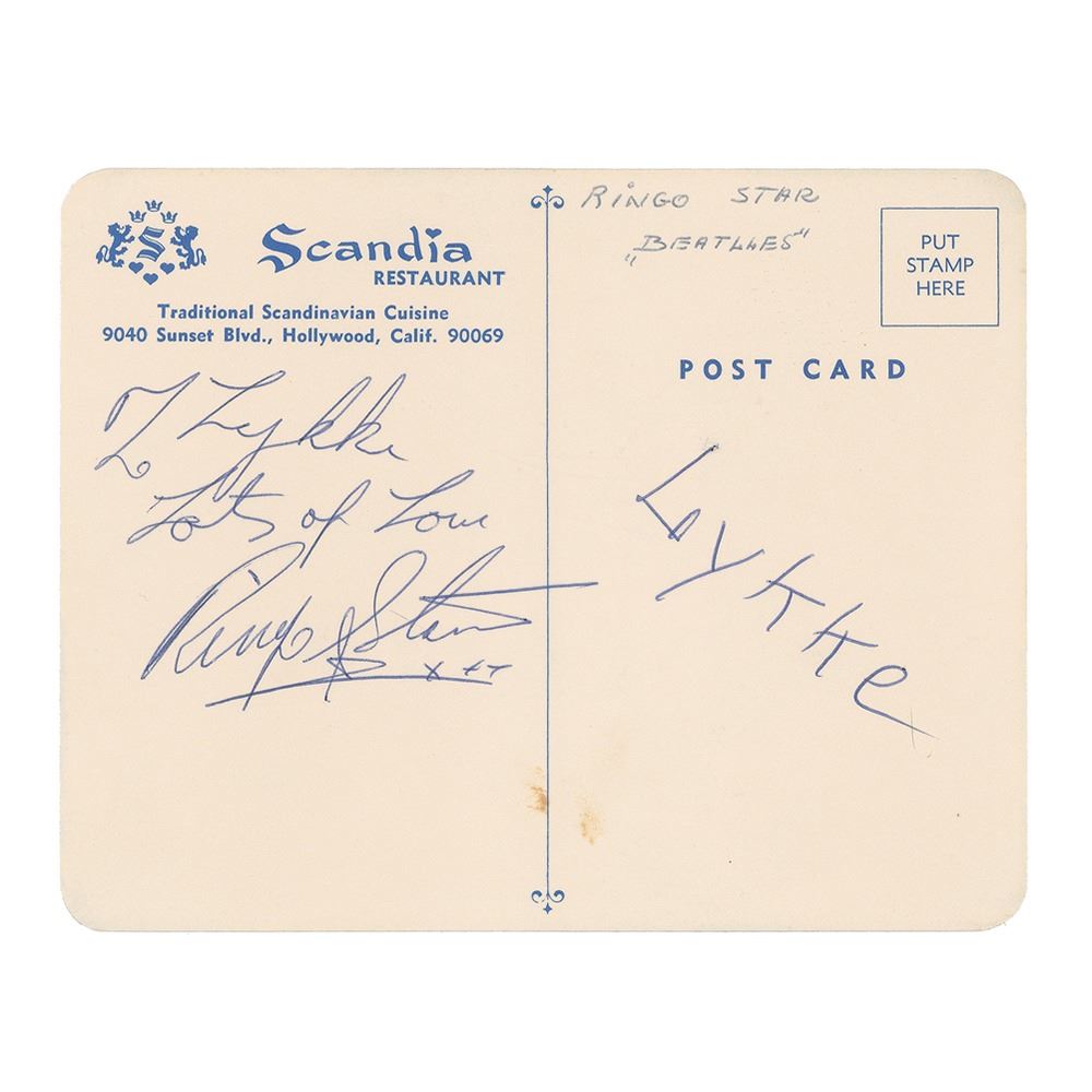 Vintage ballpoint signature and inscription, "To Lykke, Lots of Love, Ringo Starr, xxx,” on the reverse of an off-white 7 x 5.5 postcard from Hollywood's Scandia Restaurant. The recipient's name is also penned in another hand in the postcard's address area, and the signer's name is annotated along the top. In fine condition, with a couple of small stains in the lower blank area.