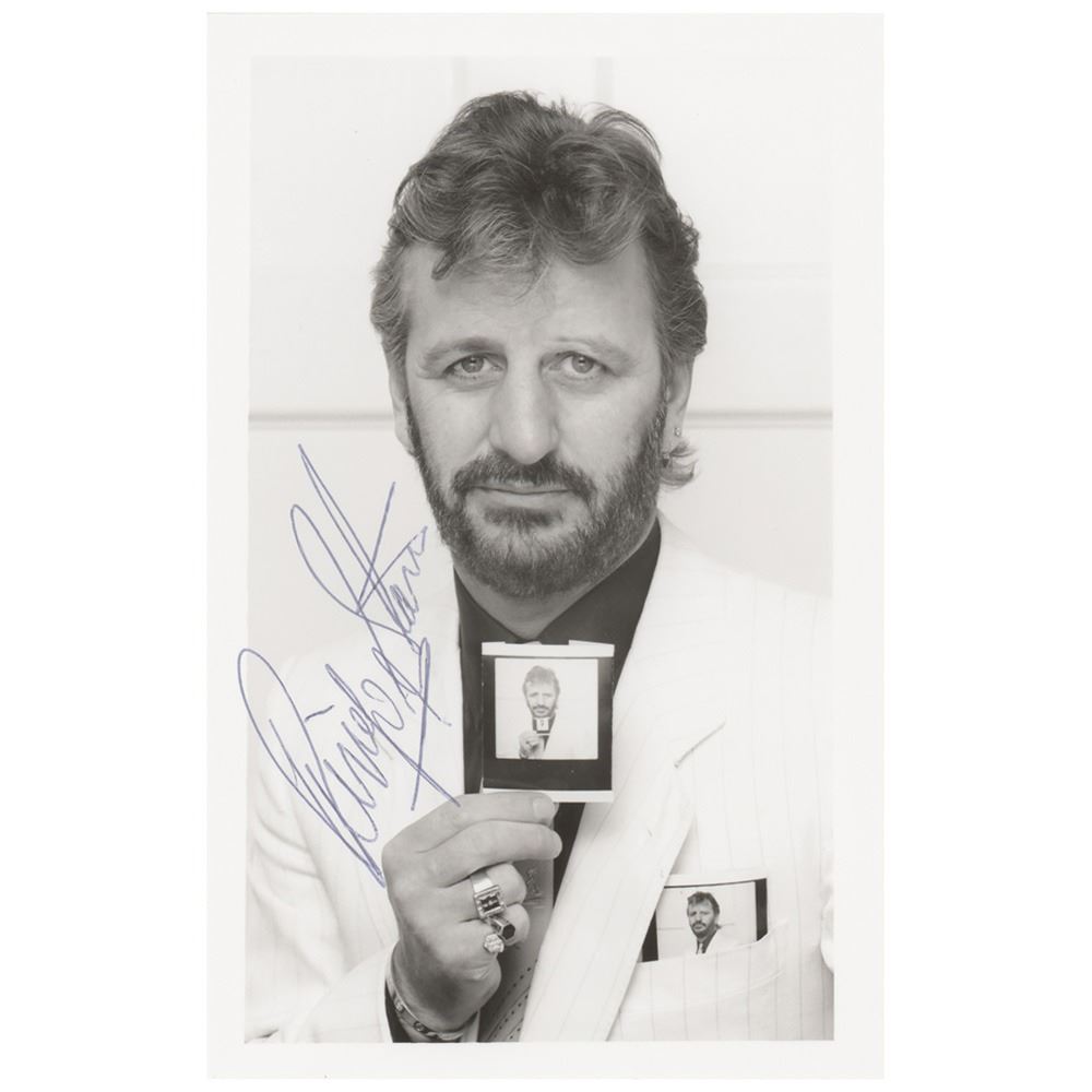 Satin-finish 3.5 x 5.5 photo of Starr holding up a Polaroid photograph of himself, signed in blue ballpoint. In fine condition.