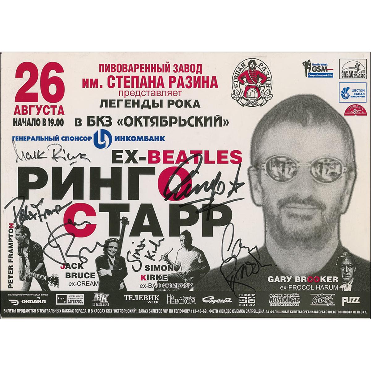 Color 11.75 x 8.5 handbill for a St. Petersburg Russia Show, signed in black felt tip, “Ringo,” adding a star for his last name, and also signed in felt tip by All Starr Band members Jack Bruce, Gary Brooker, Simon Kirke, Peter Frampton, and Mark Rivera. In fine condition, with a few scattered light creases.